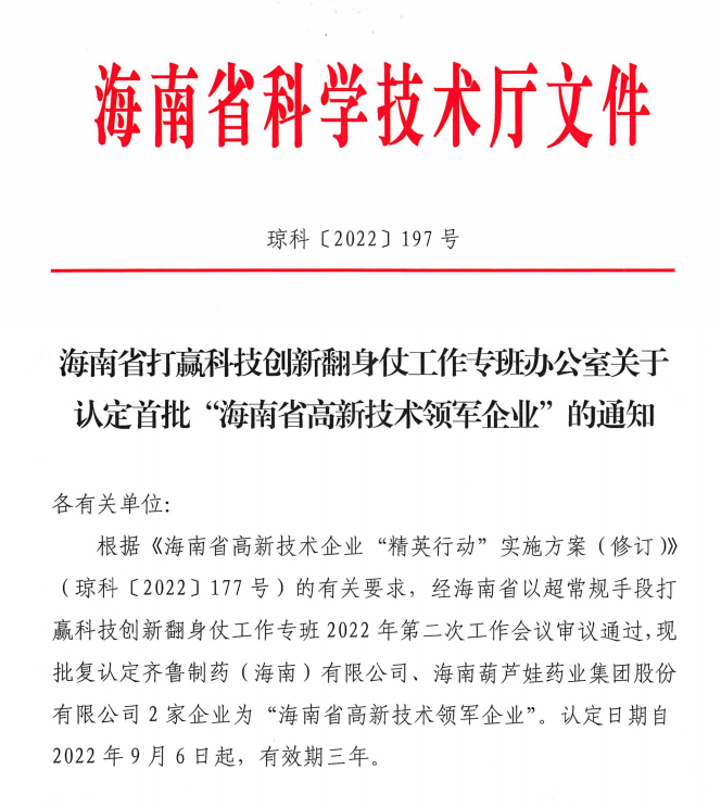 近日,海南省科学技术厅发布的《海南省打赢科技创新翻身仗工作专班办公室关于认定首批“海南省高新技术领军企业”的通知》中显示,批复认定海南yd12399云顶药业集团股份有限公司等2家企业为“海南省高新技术领军企业”。认定日期自2022年9月6日起,有效期三年。